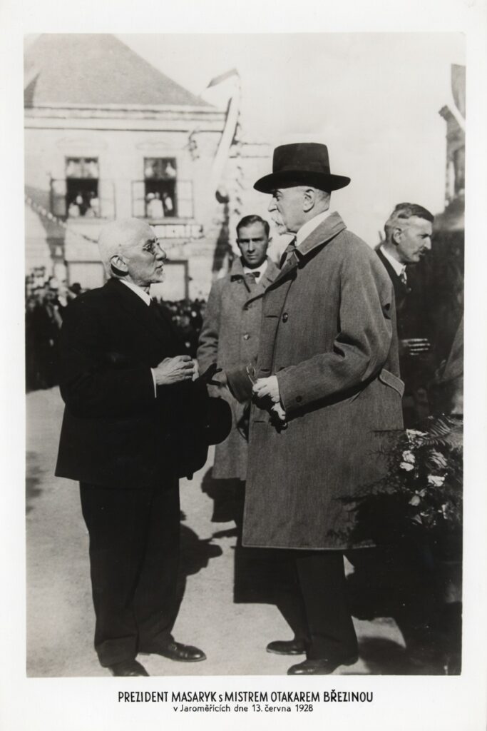 V jubilejním roce 1928 cestoval prezident Tomáš G. Masaryk po Československu. V červenci vedla jeho cesta Moravou. Jaroměřice původně nebyly součástí cestovního plánu, avšak když prezident zjistil, že se 13. července bude nacházet v Moravských Budějovicích, vyslovil přání navštívit i Jaroměřice, protože se zde chtěl setkat s básníkem Otokarem Březinou.